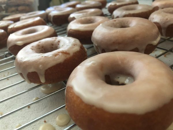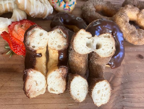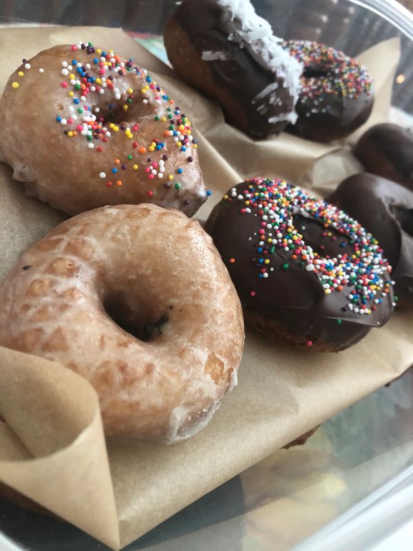 - Powdered(V), Semi-Sweet Chocolate Glazed, Maple Glazed, Maple Glazed with sprinkles, Sugar(V), Glazed